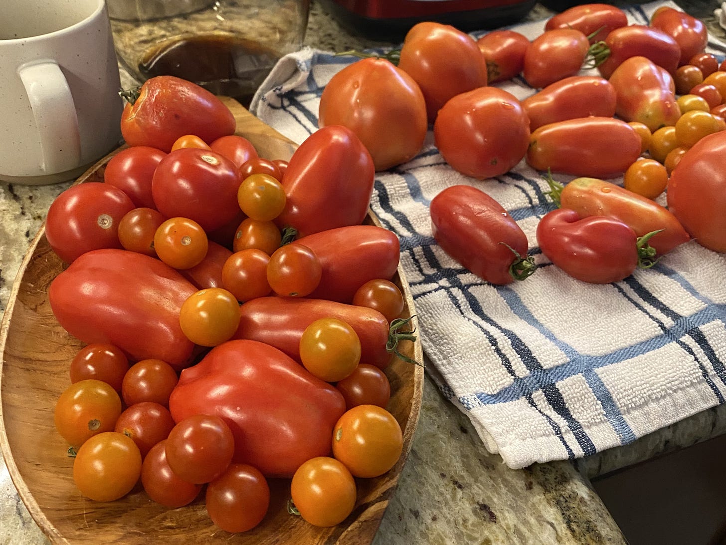I would argue that outside of the depths of winter when the food is generally at it’s gooiest and most comforting, the height of summer is the optimal time for eating and cooking. The produce does practically all of the work for us and all we have to do is enjoy. I’ve had particular success with my tomatoes this year. After many years of watching my plants grow and ripen to near perfection, only to be decimated by squirrels in the eleventh hour- the hawks have finally taken pity on me and come to my aide (sorry squirrels). My tomato plants have been, quite literally, ‘popping off’. Four varieties, unique and beautiful in their own special ways, filling my countertops, washing over my tastebuds and piling up in my stomach.