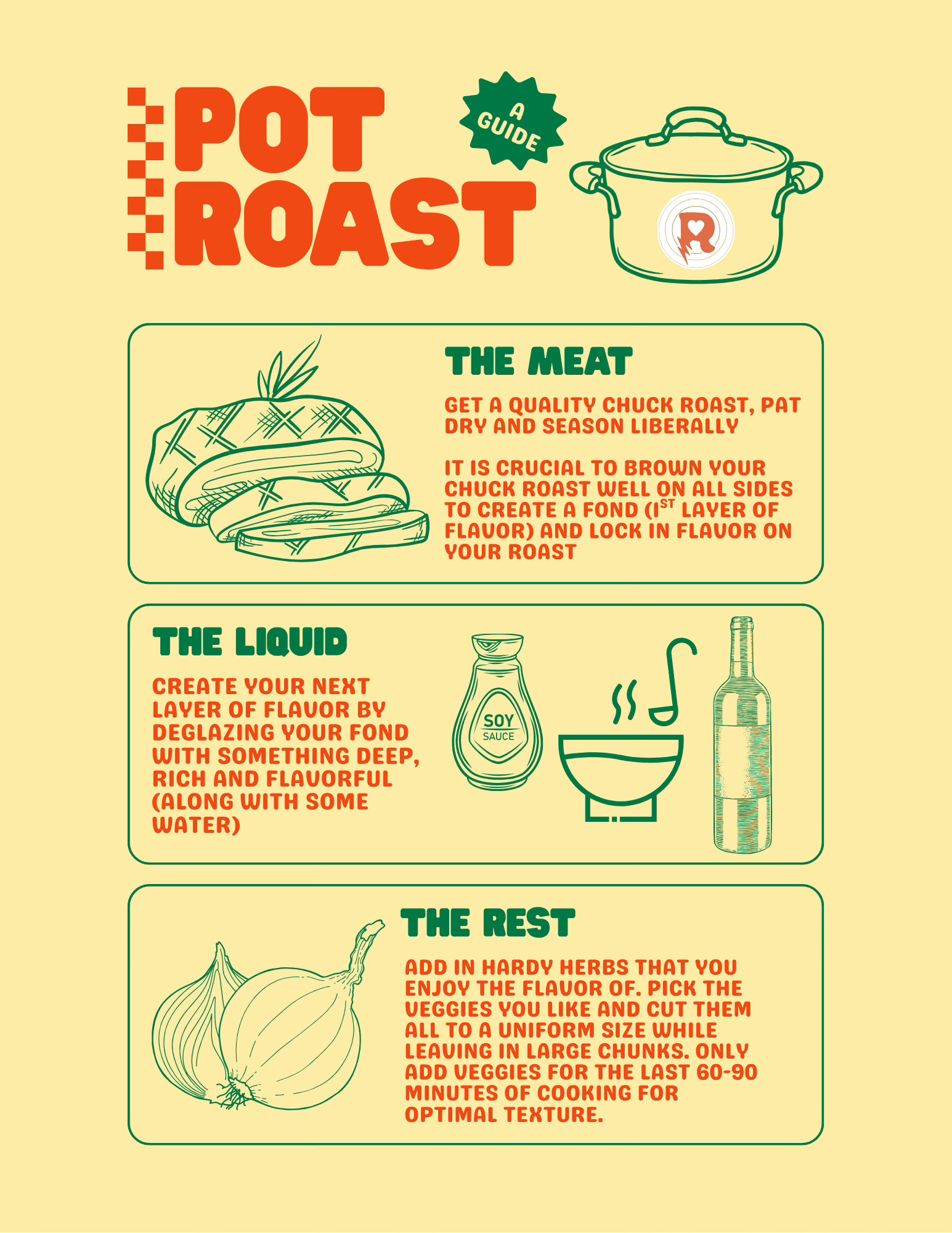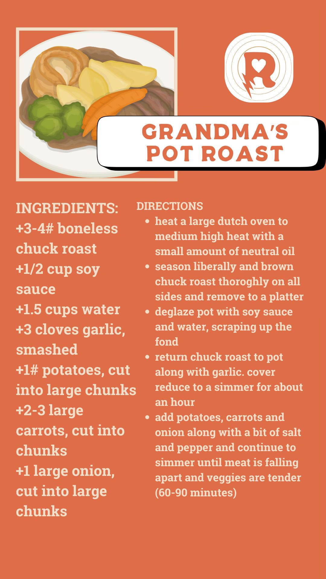 Answer: I’ll do you one better. Here are my two favorite recipes- one being my grandma’s very old school recipe that always comes out perfect and the other being of the new school and more of a beef sandwich than a pot roast though the cooking method and general concept is the same. I’ve also attached a graphic outlining the most important aspects of a truly great and flavorful pot roast that you can lay over any recipe you want to use. Enjoy!